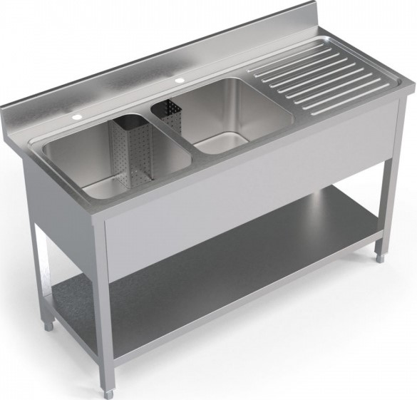 Ideal for restaurants, hotels, schools, and catering facilities, the double bowl sink features smooth welded seams, rounded corners, and reinforced legs with adjustable feet for stability and easy cleaning. Each unit can be customized with drainboards, backsplashes, undershelves, or tap holes to suit your kitchen’s configuration.